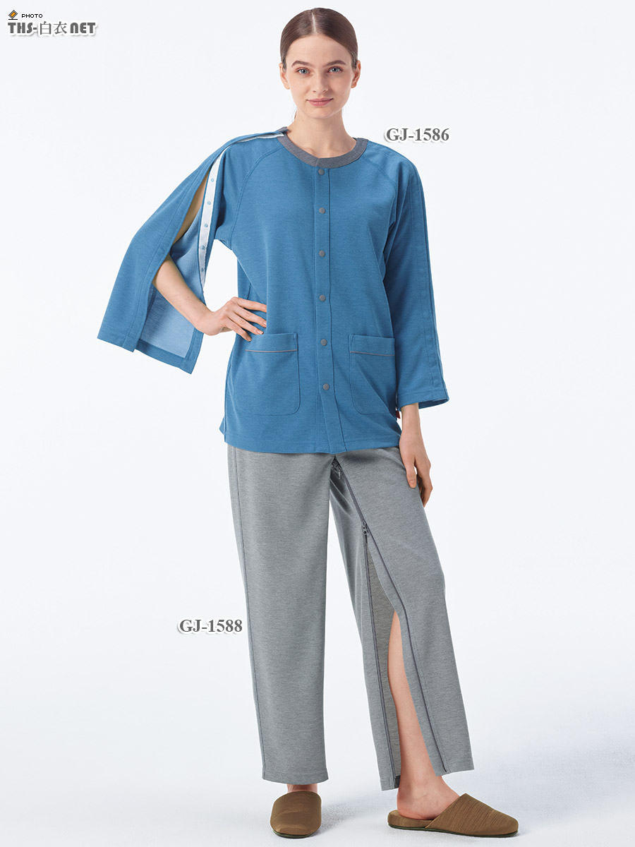 前開きなので脱ぎ着がラク。肩から袖にかけてスナップボタンがついたフルオープンタイプの患者衣上衣。サイズ表