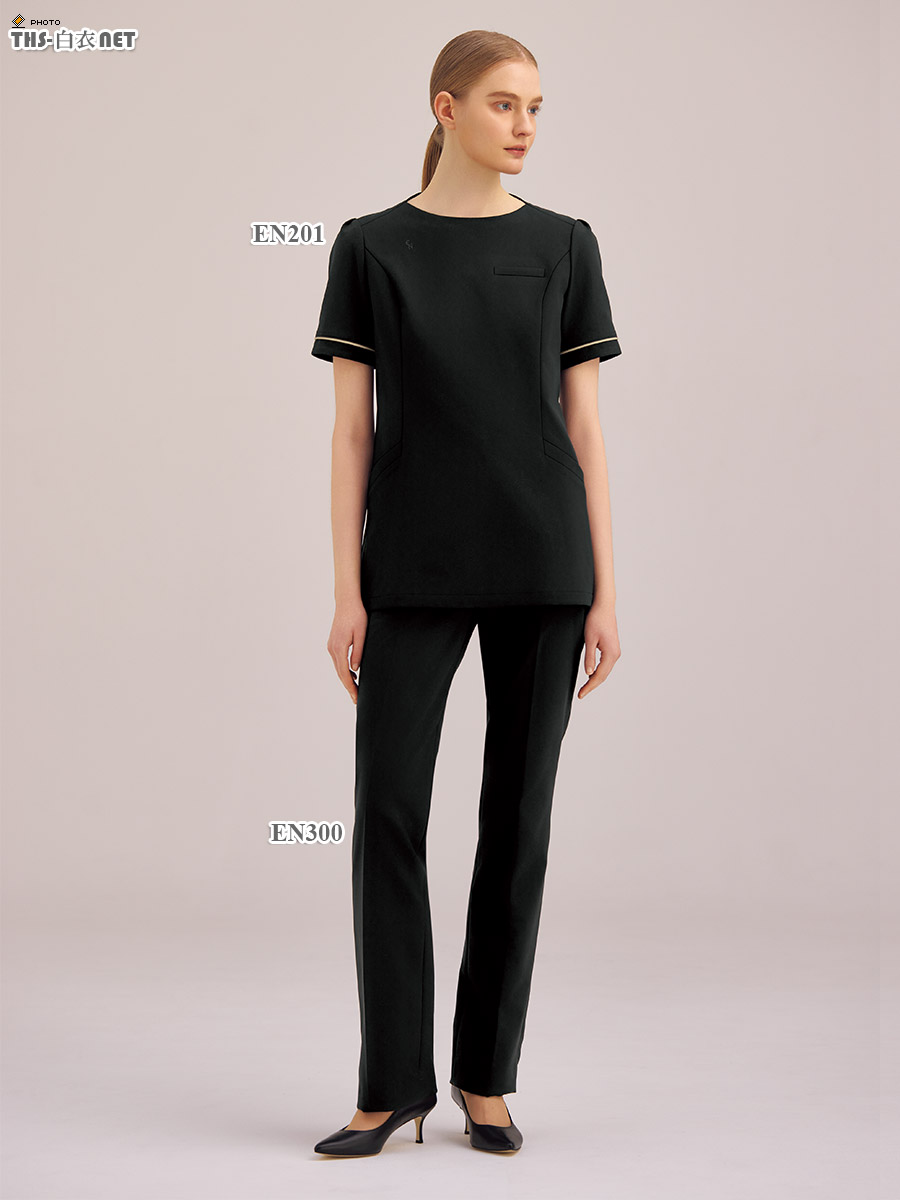 スリムすぎずゆるすぎない絶妙なバランスと、袖口のトリミングが洗練された印象。受付から施術まで幅広い業務に対応できます。-